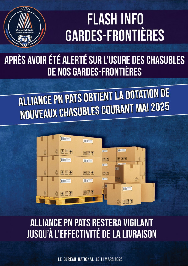 ✅ Après avoir été alertés sur l'état d'usure des chasubles de nos gardes-frontières, Alliance PN PATS obtient la dotation de nouveaux chasubles courant MAI 2025 ! 📦