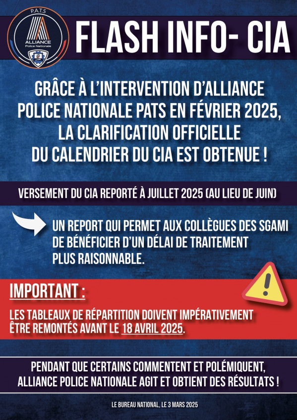 ✅ Grâce à l’intervention d’Alliance Police Nationale PATS en février 2025, la clarification officielle du calendrier du CIA est obtenue !