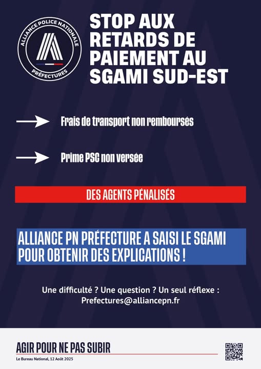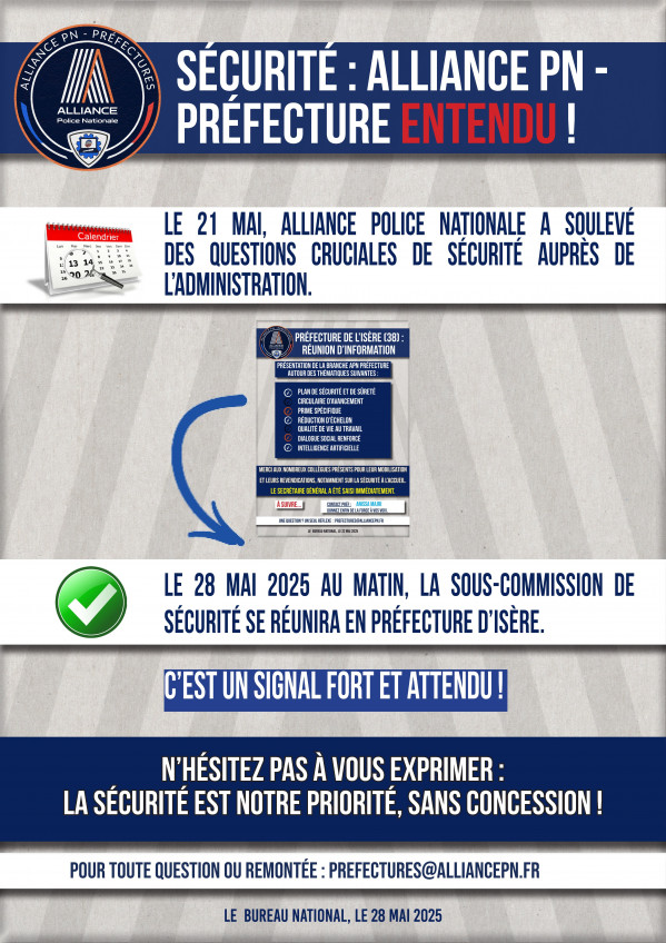 🤝 Alliance Police Nationale / Préfecture sera reçue la dans les prochains jours par le SGAMI pour obtenir des précisions sur l’ensemble des retards (ITM, CIA…) et de vos problématiques.